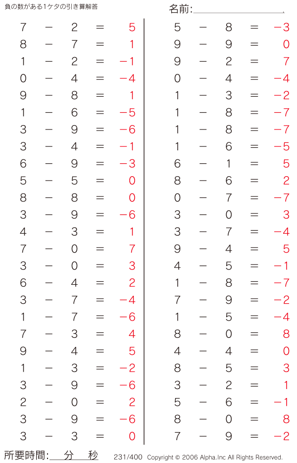 上記のボタンから「負の数がある1ケタの引き算」の算数数学ドリル・計算ドリル(PDFプリント)がダウンロードできます。個人利用は無料です(家庭以外での配布は有料です)。