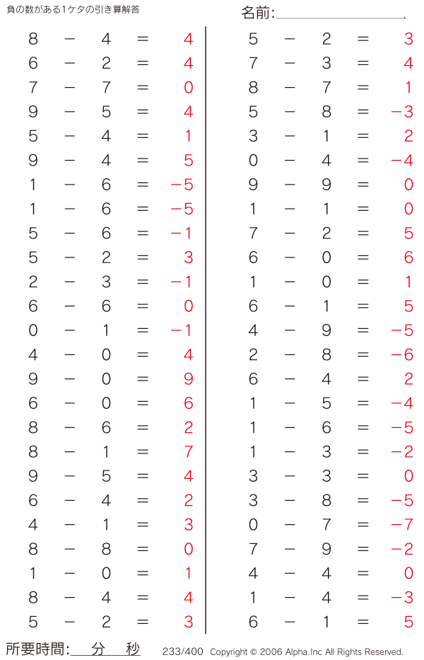 上記のボタンから「負の数がある1ケタの引き算」の算数数学ドリル・計算ドリル(PDFプリント)がダウンロードできます。個人利用は無料です(家庭以外での配布は有料です)。