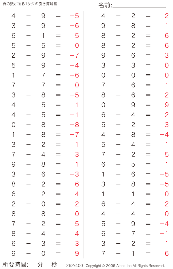 上記のボタンから「負の数がある1ケタの引き算」の算数数学ドリル・計算ドリル(PDFプリント)がダウンロードできます。個人利用は無料です(家庭以外での配布は有料です)。