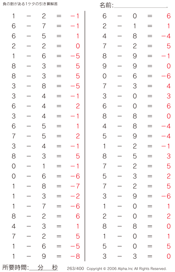 上記のボタンから「負の数がある1ケタの引き算」の算数数学ドリル・計算ドリル(PDFプリント)がダウンロードできます。個人利用は無料です(家庭以外での配布は有料です)。