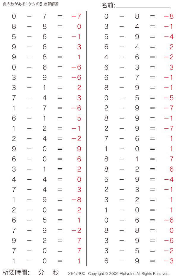 上記のボタンから「負の数がある1ケタの引き算」の算数数学ドリル・計算ドリル(PDFプリント)がダウンロードできます。個人利用は無料です(家庭以外での配布は有料です)。