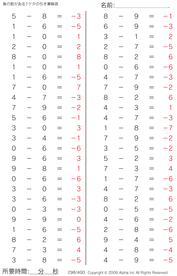 上記のボタンから「負の数がある1ケタの引き算」の算数数学ドリル・計算ドリル(PDFプリント)がダウンロードできます。個人利用は無料です(家庭以外での配布は有料です)。