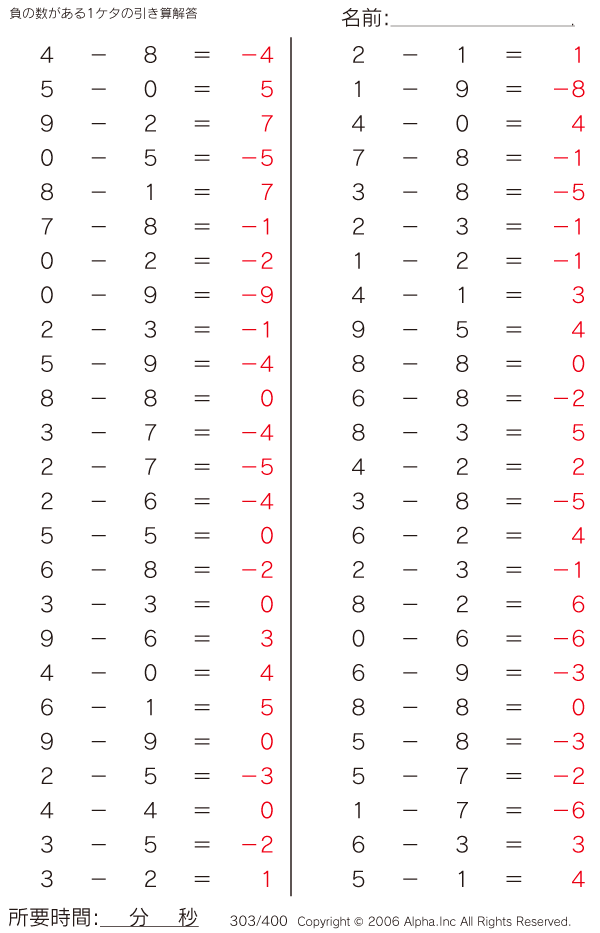 上記のボタンから「負の数がある1ケタの引き算」の算数数学ドリル・計算ドリル(PDFプリント)がダウンロードできます。個人利用は無料です(家庭以外での配布は有料です)。