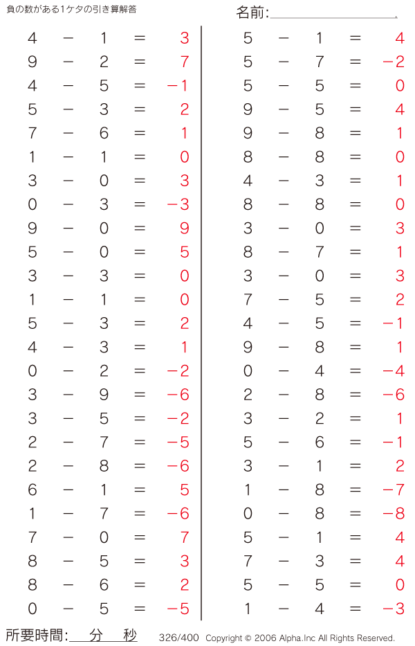 上記のボタンから「負の数がある1ケタの引き算」の算数数学ドリル・計算ドリル(PDFプリント)がダウンロードできます。個人利用は無料です(家庭以外での配布は有料です)。