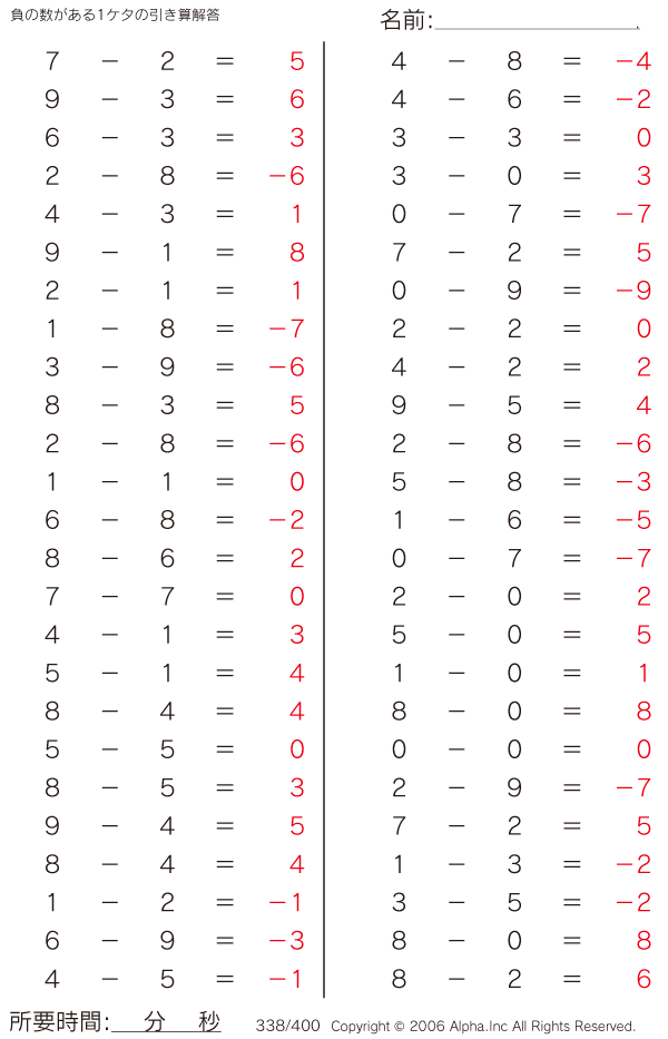 上記のボタンから「負の数がある1ケタの引き算」の算数数学ドリル・計算ドリル(PDFプリント)がダウンロードできます。個人利用は無料です(家庭以外での配布は有料です)。