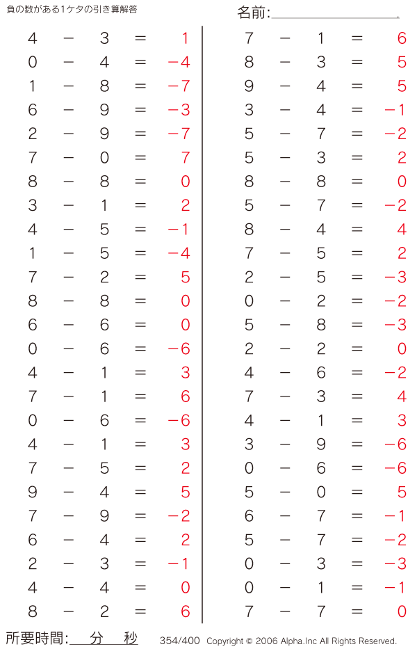 負の数がある1ケタの引き算 [解答]354/400
