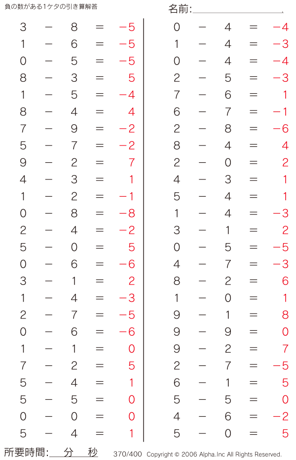 上記のボタンから「負の数がある1ケタの引き算」の算数数学ドリル・計算ドリル(PDFプリント)がダウンロードできます。個人利用は無料です(家庭以外での配布は有料です)。