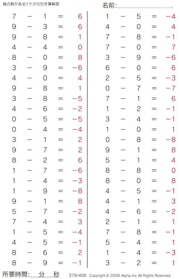 上記のボタンから「負の数がある1ケタの引き算」の算数数学ドリル・計算ドリル(PDFプリント)がダウンロードできます。個人利用は無料です(家庭以外での配布は有料です)。