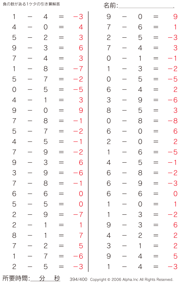 上記のボタンから「負の数がある1ケタの引き算」の算数数学ドリル・計算ドリル(PDFプリント)がダウンロードできます。個人利用は無料です(家庭以外での配布は有料です)。