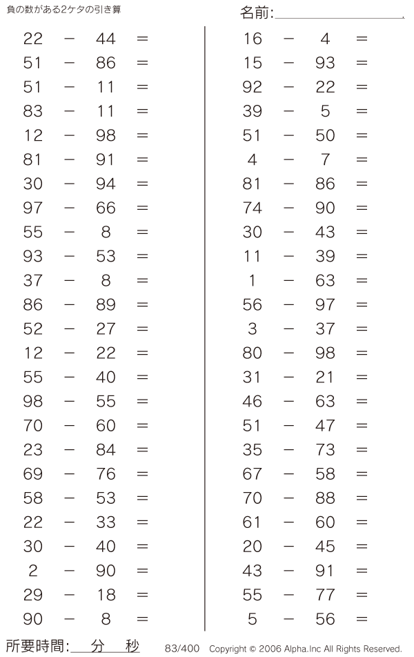 上記のボタンから「負の数がある2ケタの引き算」の算数数学ドリル・計算ドリル(PDFプリント)がダウンロードできます。個人利用は無料です(家庭以外での配布は有料です)。