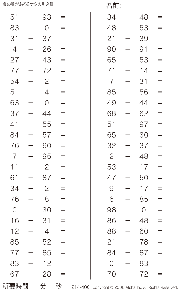 負の数がある2ケタの引き算 [問題]214/400