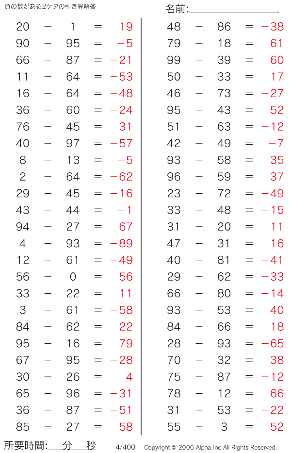 上記のボタンから「負の数がある2ケタの引き算」の算数数学ドリル・計算ドリル(PDFプリント)がダウンロードできます。個人利用は無料です(家庭以外での配布は有料です)。