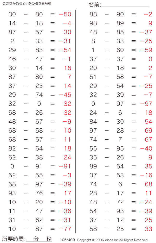負の数がある2ケタの引き算 [解答]105/400