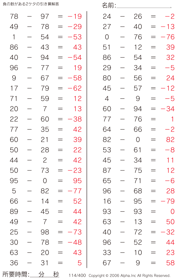負の数がある2ケタの引き算 [解答]114/400