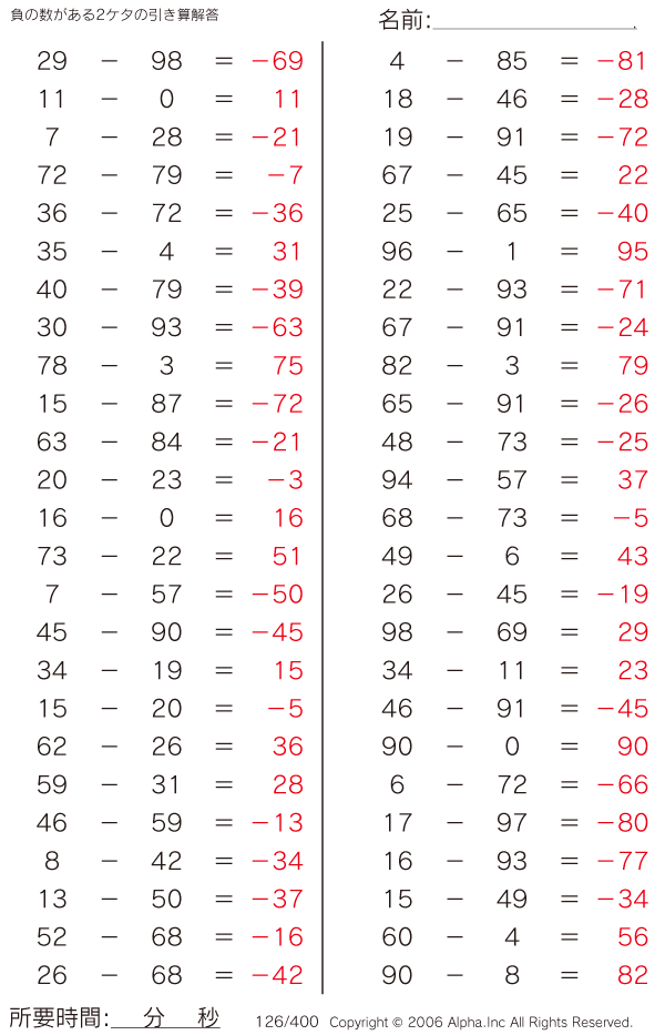 負の数がある2ケタの引き算 [解答]126/400