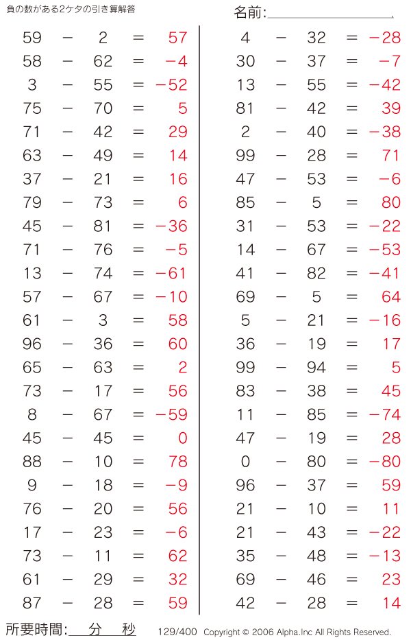 負の数がある2ケタの引き算 [解答]129/400
