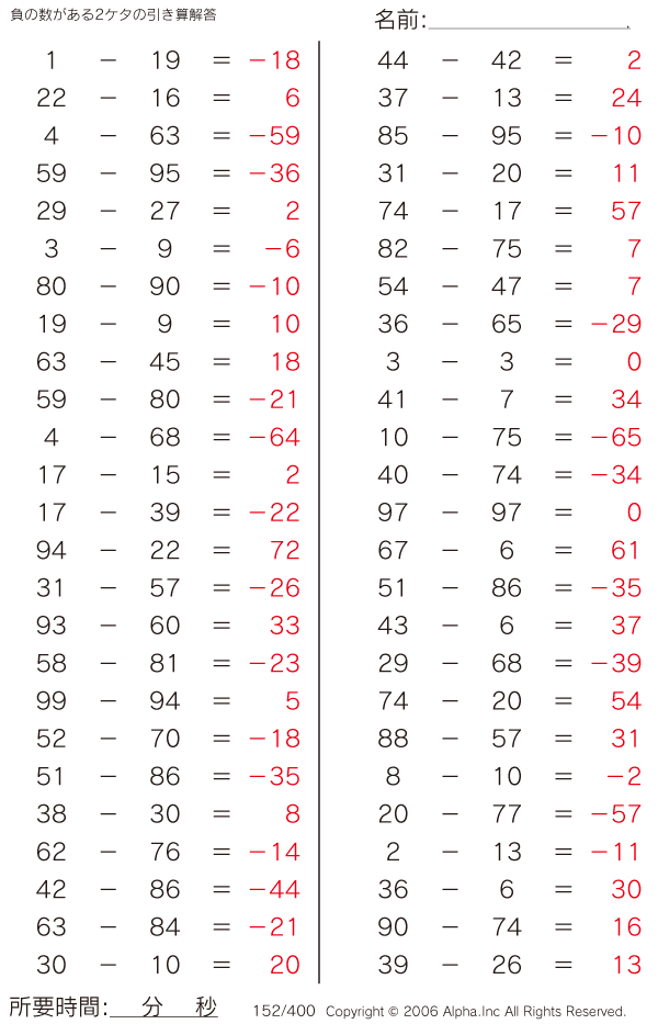 負の数がある2ケタの引き算 [解答]152/400