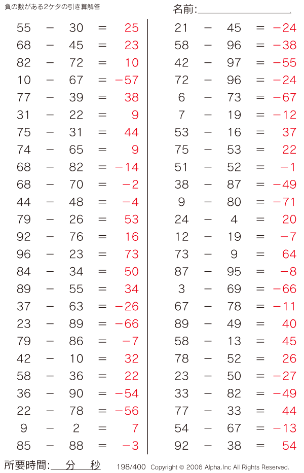 上記のボタンから「負の数がある2ケタの引き算」の算数数学ドリル・計算ドリル(PDFプリント)がダウンロードできます。個人利用は無料です(家庭以外での配布は有料です)。
