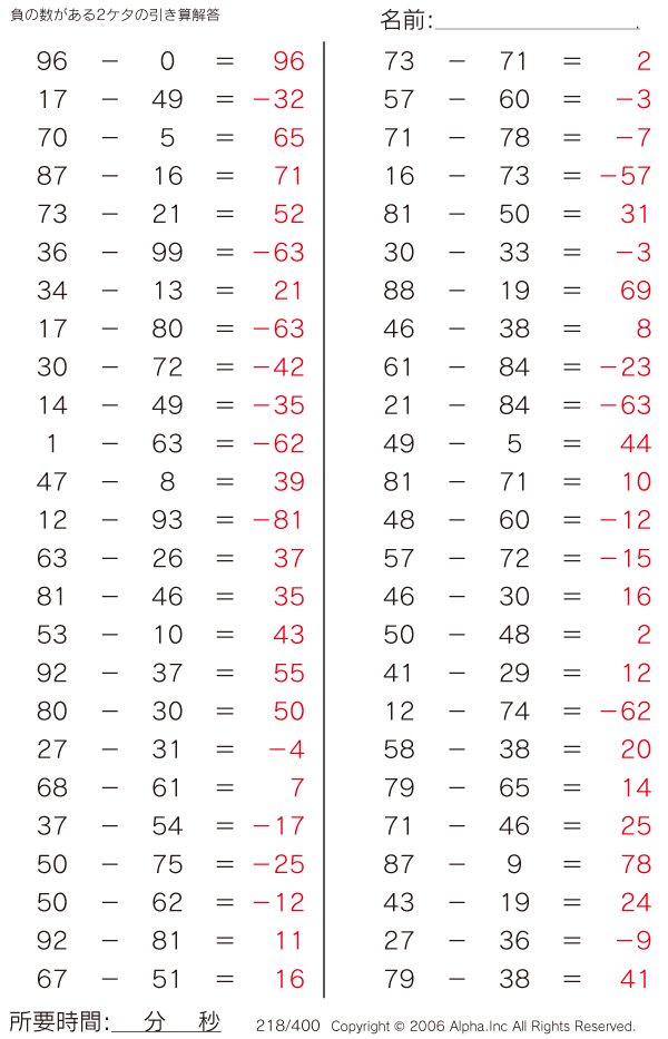 上記のボタンから「負の数がある2ケタの引き算」の算数数学ドリル・計算ドリル(PDFプリント)がダウンロードできます。個人利用は無料です(家庭以外での配布は有料です)。