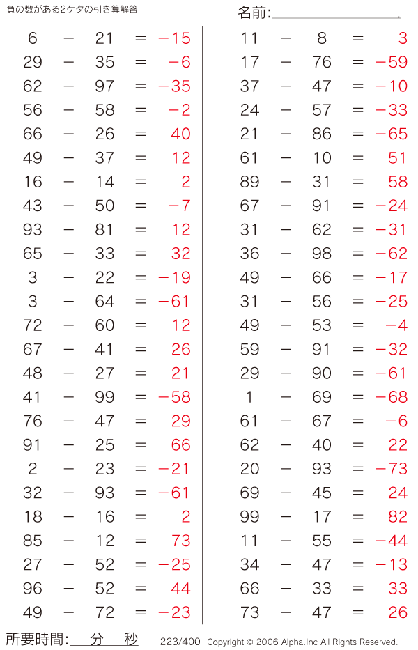 負の数がある2ケタの引き算 [解答]223/400