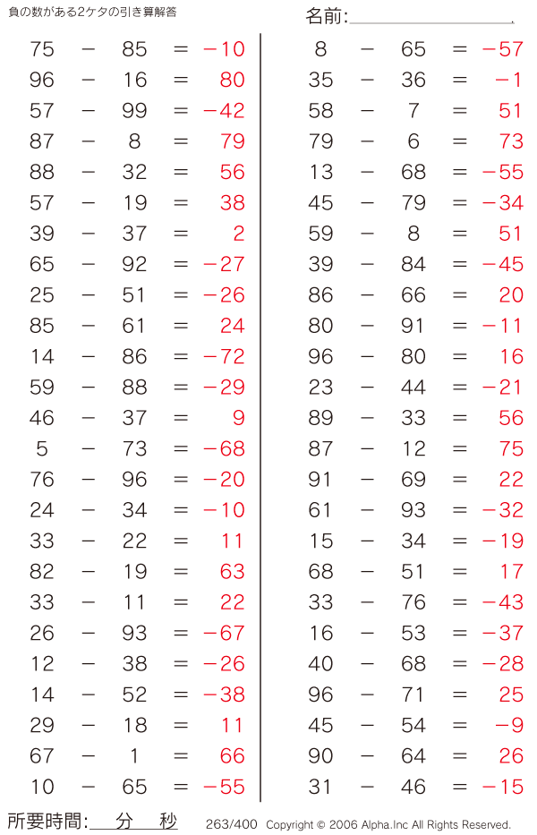 上記のボタンから「負の数がある2ケタの引き算」の算数数学ドリル・計算ドリル(PDFプリント)がダウンロードできます。個人利用は無料です(家庭以外での配布は有料です)。