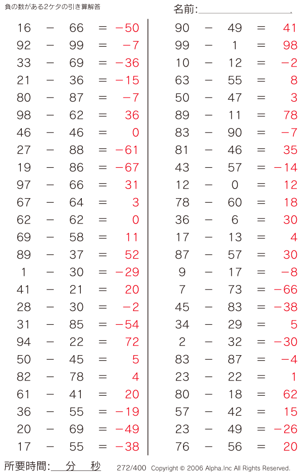 上記のボタンから「負の数がある2ケタの引き算」の算数数学ドリル・計算ドリル(PDFプリント)がダウンロードできます。個人利用は無料です(家庭以外での配布は有料です)。
