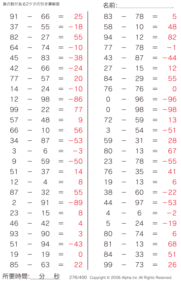 上記のボタンから「負の数がある2ケタの引き算」の算数数学ドリル・計算ドリル(PDFプリント)がダウンロードできます。個人利用は無料です(家庭以外での配布は有料です)。