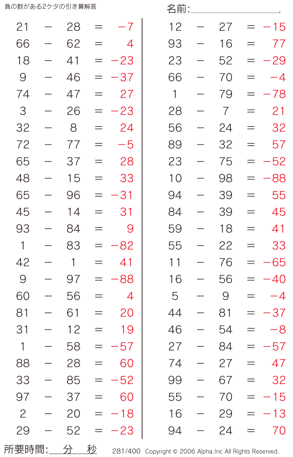 上記のボタンから「負の数がある2ケタの引き算」の算数数学ドリル・計算ドリル(PDFプリント)がダウンロードできます。個人利用は無料です(家庭以外での配布は有料です)。
