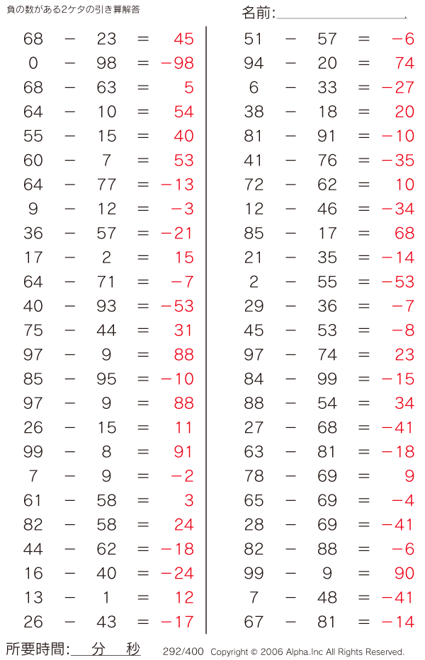 上記のボタンから「負の数がある2ケタの引き算」の算数数学ドリル・計算ドリル(PDFプリント)がダウンロードできます。個人利用は無料です(家庭以外での配布は有料です)。