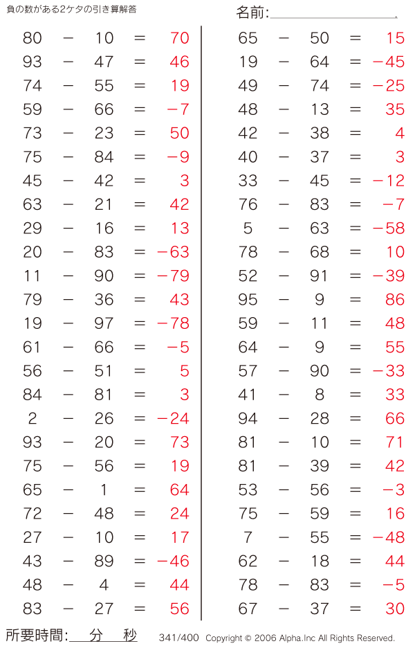上記のボタンから「負の数がある2ケタの引き算」の算数数学ドリル・計算ドリル(PDFプリント)がダウンロードできます。個人利用は無料です(家庭以外での配布は有料です)。