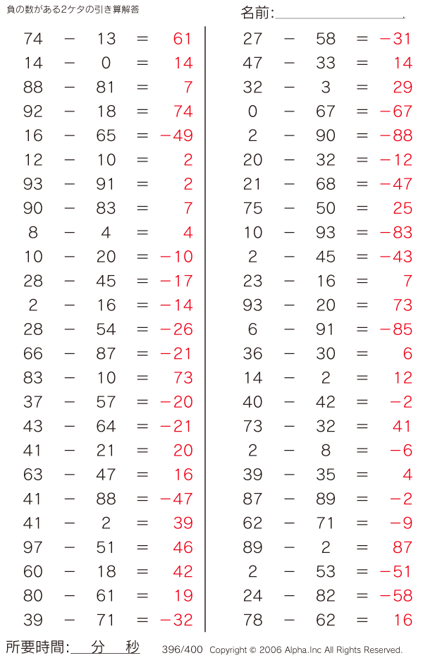 上記のボタンから「負の数がある2ケタの引き算」の算数数学ドリル・計算ドリル(PDFプリント)がダウンロードできます。個人利用は無料です(家庭以外での配布は有料です)。