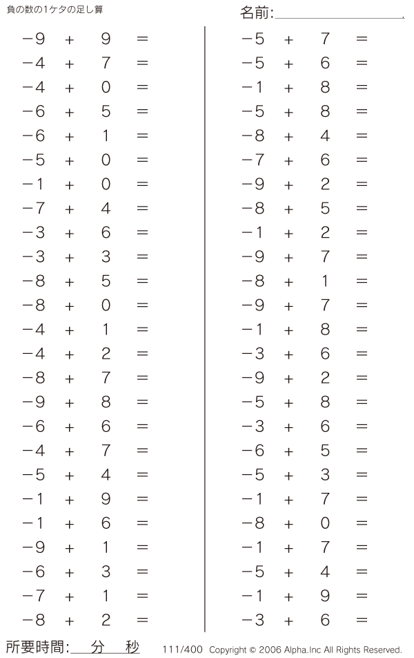 負の数の1ケタの足し算 [問題]111/400