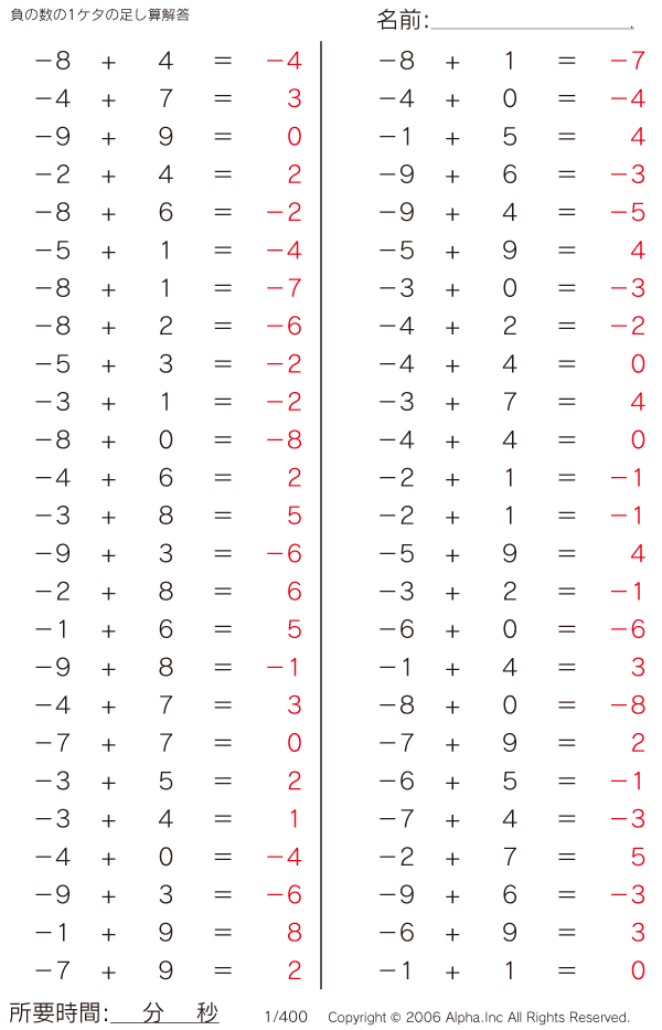 上記のボタンから「負の数の1ケタの足し算」の算数数学ドリル・計算ドリル(PDFプリント)がダウンロードできます。個人利用は無料です(家庭以外での配布は有料です)。