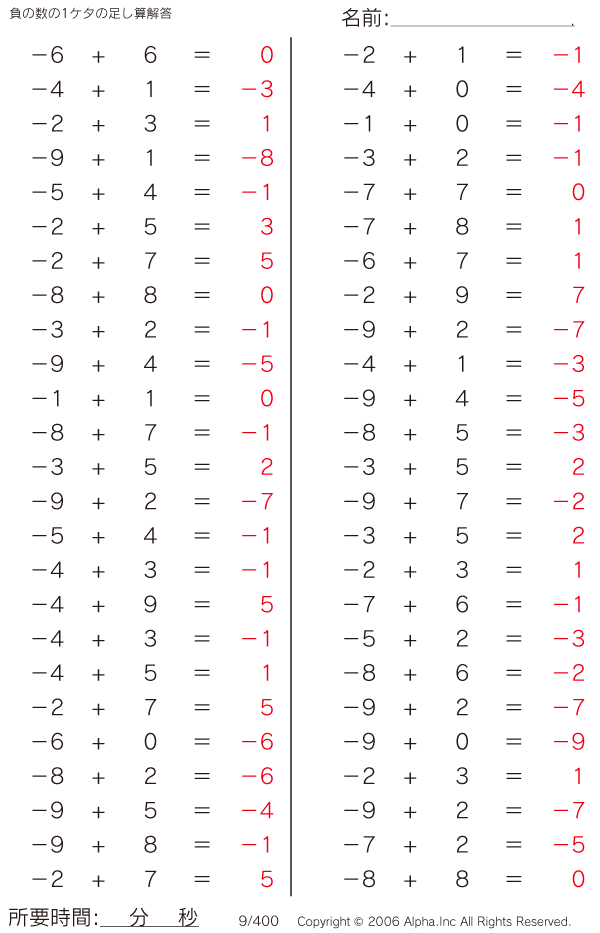 上記のボタンから「負の数の1ケタの足し算」の算数数学ドリル・計算ドリル(PDFプリント)がダウンロードできます。個人利用は無料です(家庭以外での配布は有料です)。