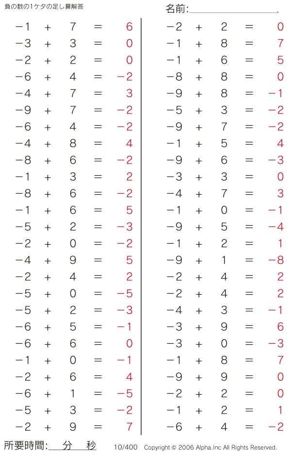 負の数の1ケタの足し算 [解答]010/400