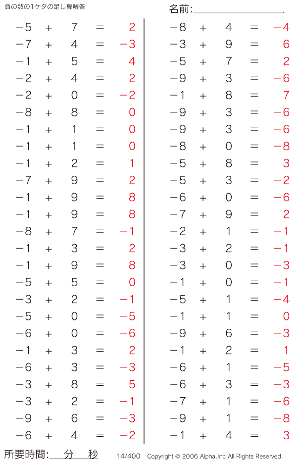 負の数の1ケタの足し算 [解答]014/400