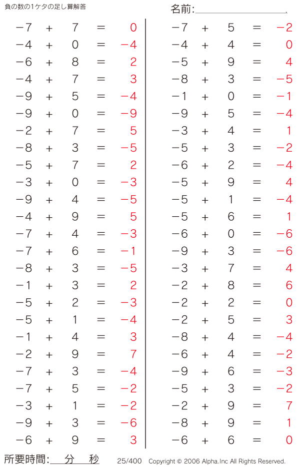 負の数の1ケタの足し算 [解答]025/400