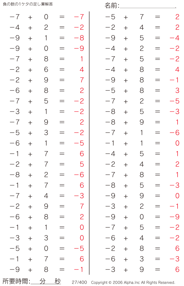 負の数の1ケタの足し算 [解答]027/400