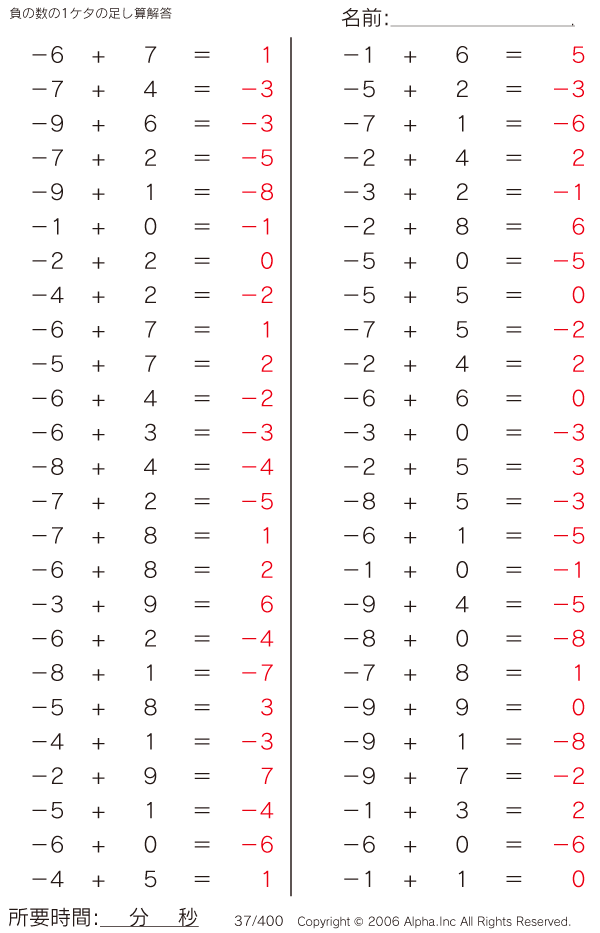 上記のボタンから「負の数の1ケタの足し算」の算数数学ドリル・計算ドリル(PDFプリント)がダウンロードできます。個人利用は無料です(家庭以外での配布は有料です)。
