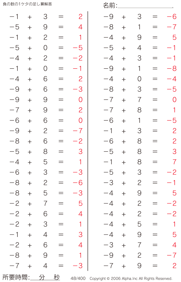 上記のボタンから「負の数の1ケタの足し算」の算数数学ドリル・計算ドリル(PDFプリント)がダウンロードできます。個人利用は無料です(家庭以外での配布は有料です)。