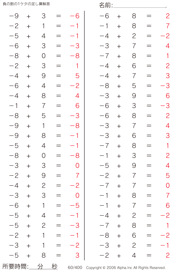 負の数の1ケタの足し算 [解答]060/400
