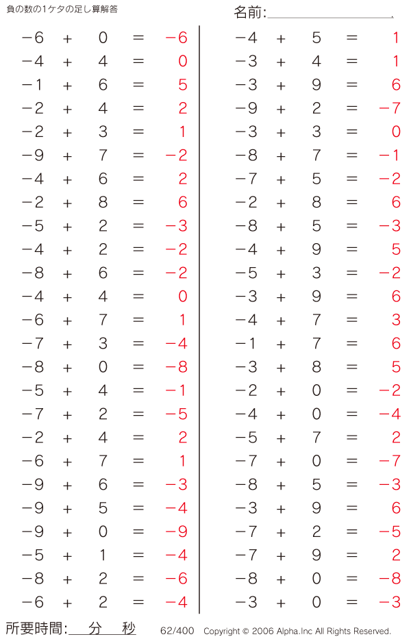 上記のボタンから「負の数の1ケタの足し算」の算数数学ドリル・計算ドリル(PDFプリント)がダウンロードできます。個人利用は無料です(家庭以外での配布は有料です)。