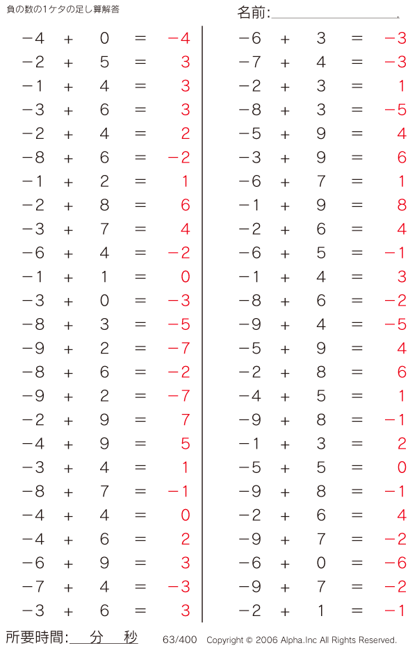 上記のボタンから「負の数の1ケタの足し算」の算数数学ドリル・計算ドリル(PDFプリント)がダウンロードできます。個人利用は無料です(家庭以外での配布は有料です)。