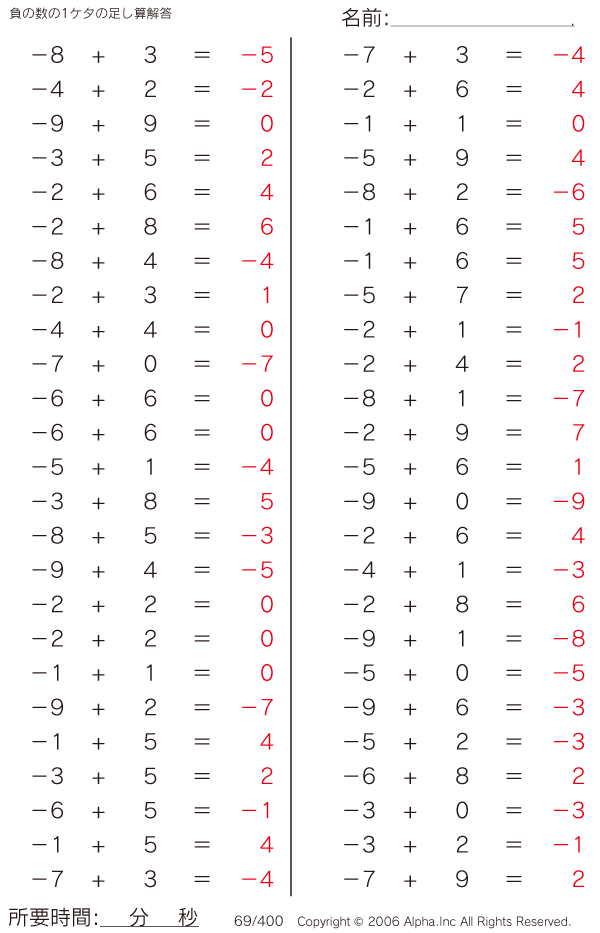 上記のボタンから「負の数の1ケタの足し算」の算数数学ドリル・計算ドリル(PDFプリント)がダウンロードできます。個人利用は無料です(家庭以外での配布は有料です)。