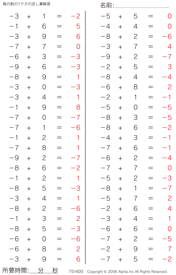 上記のボタンから「負の数の1ケタの足し算」の算数数学ドリル・計算ドリル(PDFプリント)がダウンロードできます。個人利用は無料です(家庭以外での配布は有料です)。