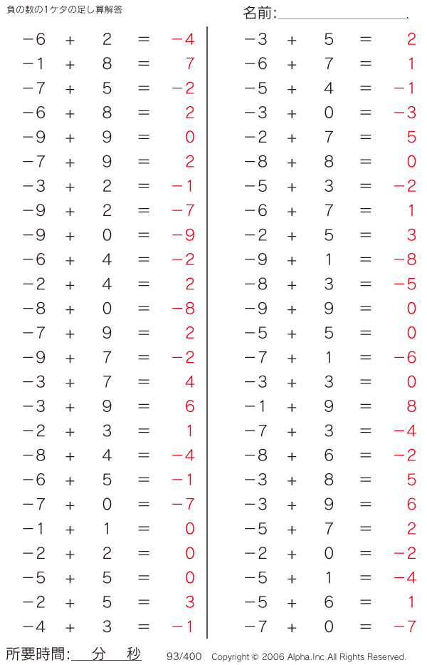 上記のボタンから「負の数の1ケタの足し算」の算数数学ドリル・計算ドリル(PDFプリント)がダウンロードできます。個人利用は無料です(家庭以外での配布は有料です)。