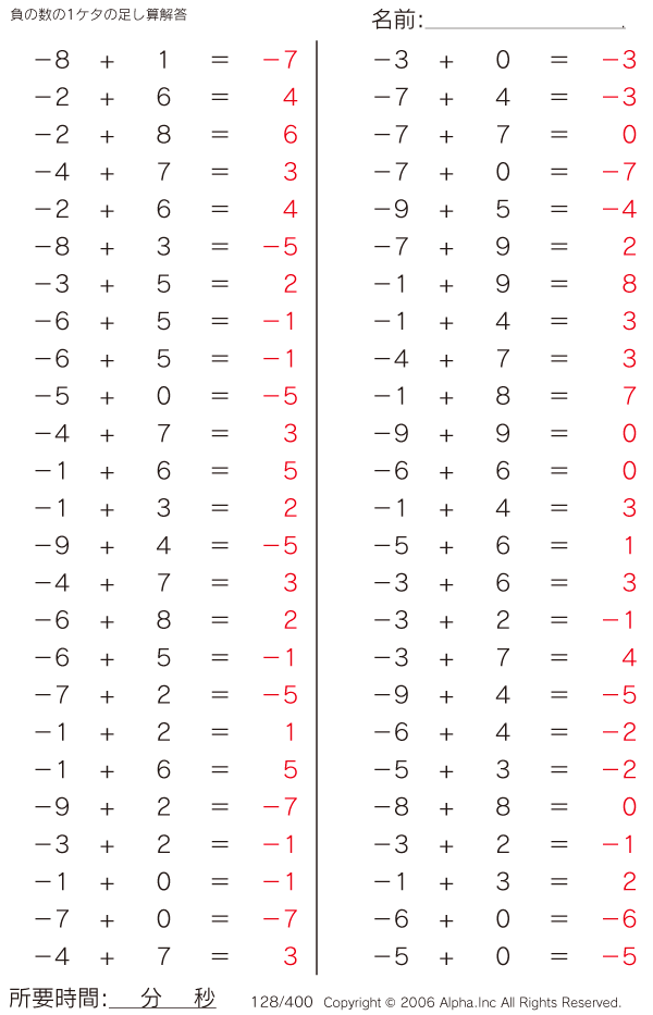 上記のボタンから「負の数の1ケタの足し算」の算数数学ドリル・計算ドリル(PDFプリント)がダウンロードできます。個人利用は無料です(家庭以外での配布は有料です)。
