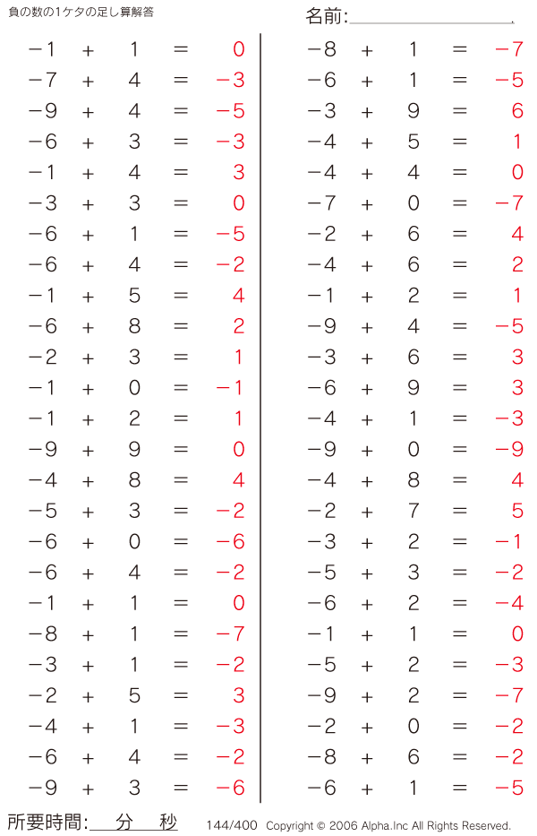 上記のボタンから「負の数の1ケタの足し算」の算数数学ドリル・計算ドリル(PDFプリント)がダウンロードできます。個人利用は無料です(家庭以外での配布は有料です)。