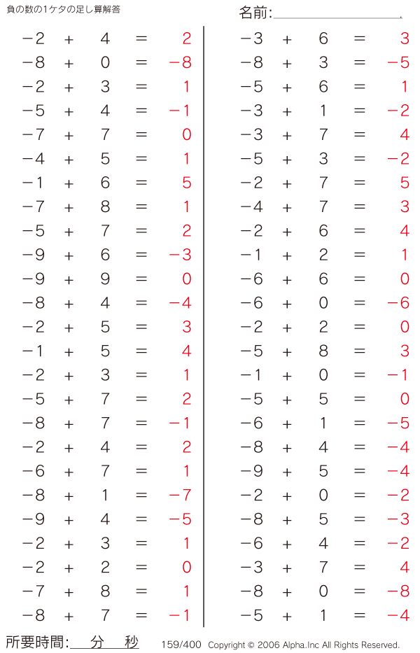 上記のボタンから「負の数の1ケタの足し算」の算数数学ドリル・計算ドリル(PDFプリント)がダウンロードできます。個人利用は無料です(家庭以外での配布は有料です)。