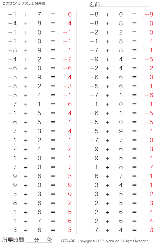 負の数の1ケタの足し算 [解答]177/400